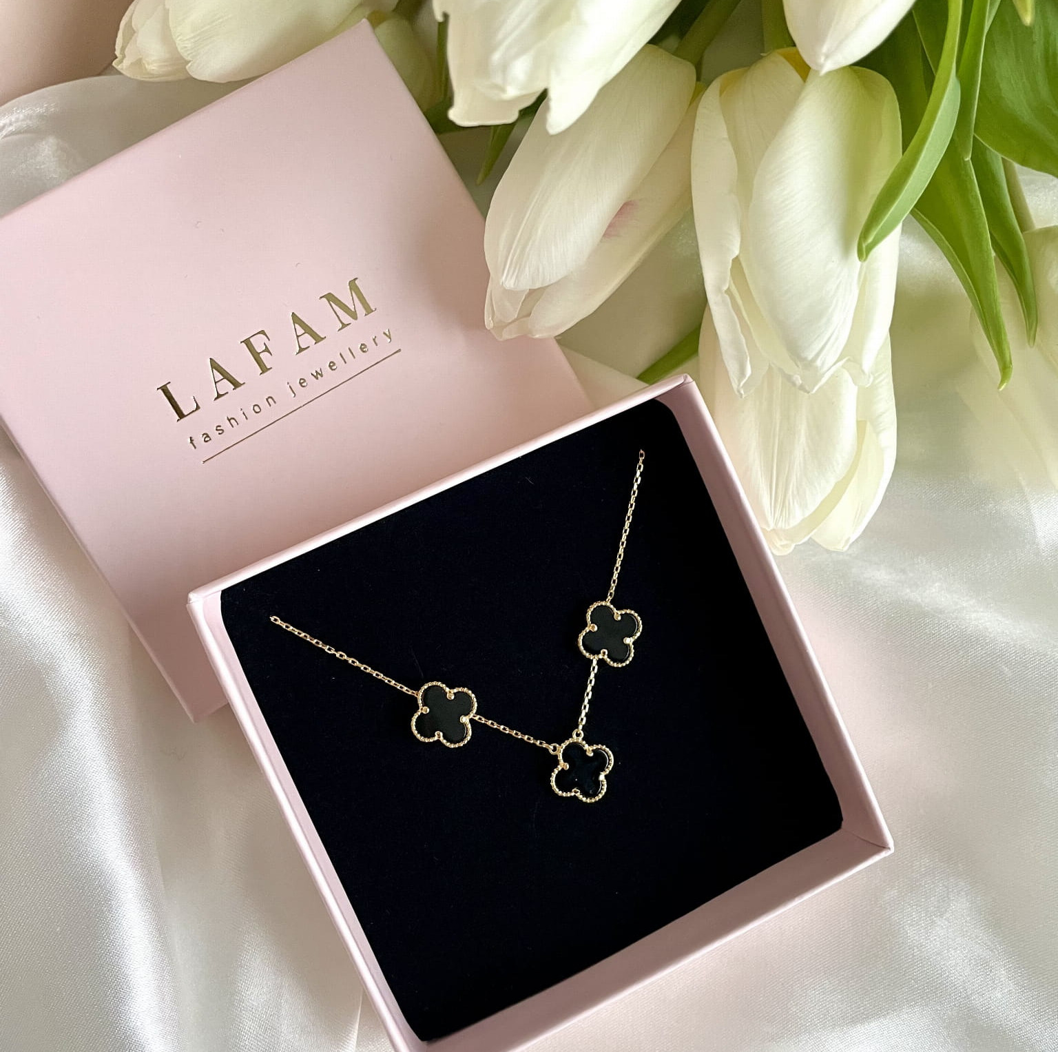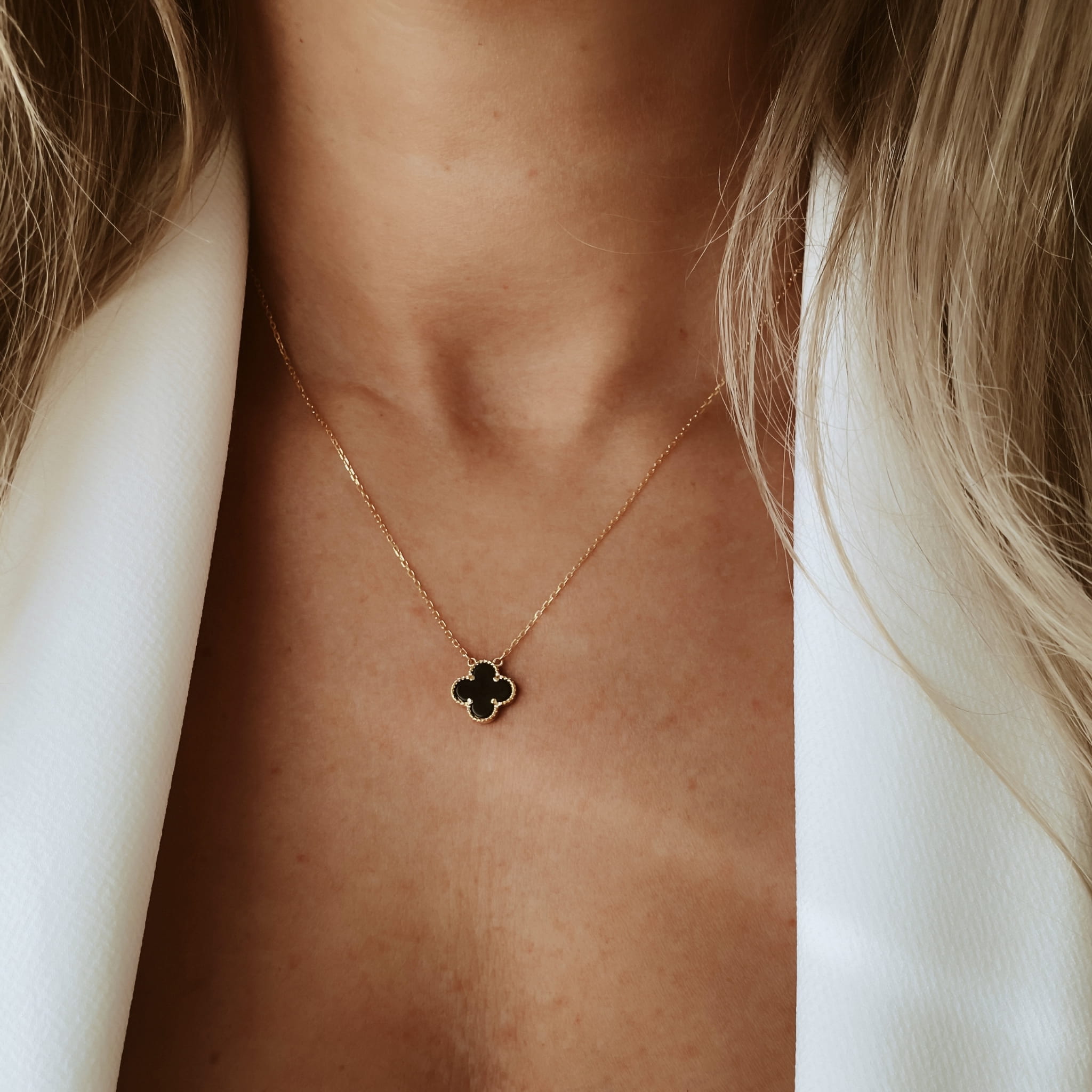 Naszyjnik z centralnie umieszczoną, dwustronną zawieszką w kształcie koniczyny dopełnia całość, tworząc wyjątkowy efekt subtelnego blasku. Drobny splot łańcuszka idealnie współgra ze złoconymi krawędziami zawieszki, podkreślając jej elegancki charakter i zapewniając wygodę noszenia – zawieszka nie przesuwa się po łańcuszku.