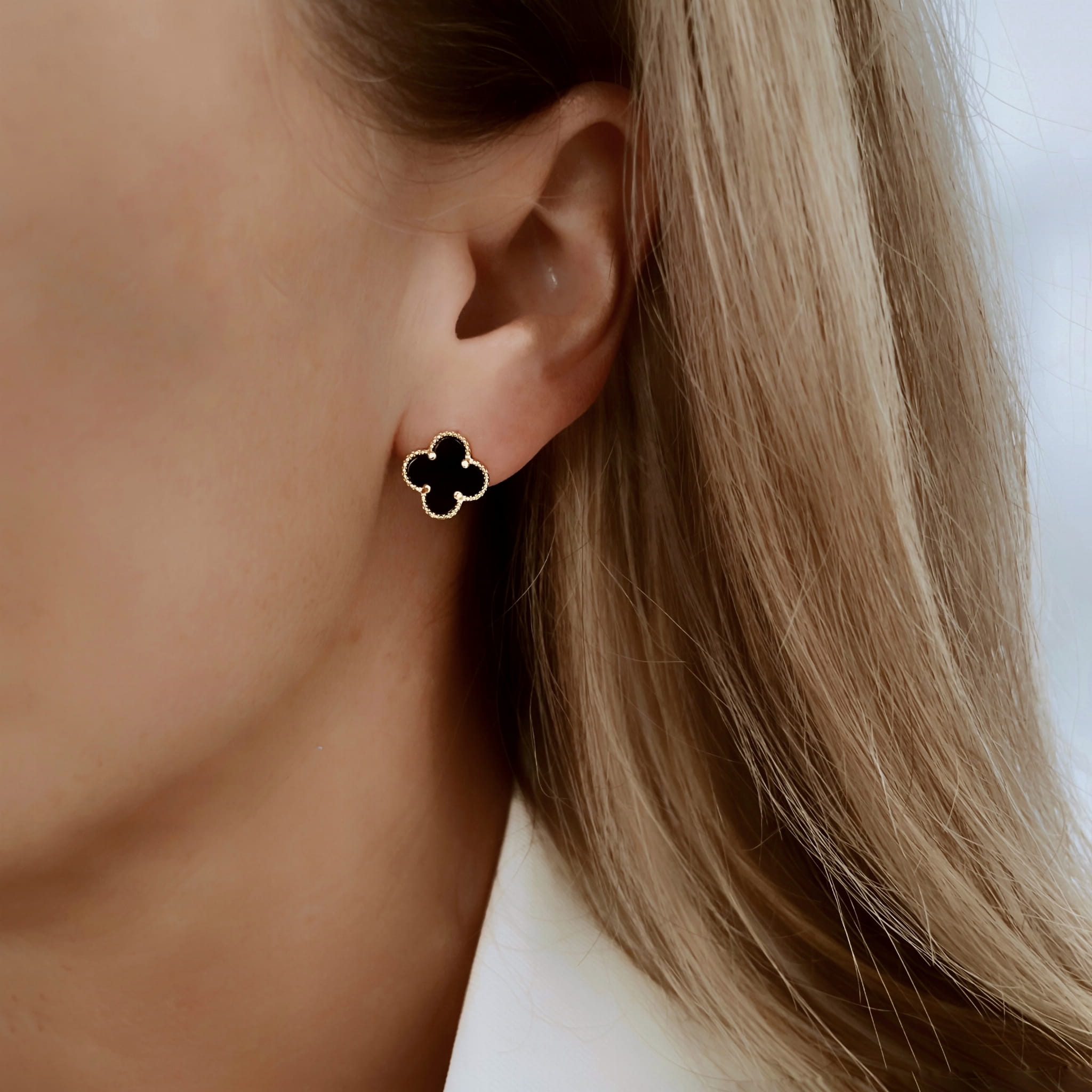 Komplet biżuterii z motywem małej czarnej marokańskiej koniczyny w złotym okuciu to harmonijne połączenie subtelnej elegancji i nowoczesnego designu. Składający się z kolczyków sztyftów oraz naszyjnika z zawieszką, zestaw ten przyciąga uwagę wyrazistym, a jednocześnie niezwykle delikatnym motywem koniczyny, który idealnie wpisuje się w najnowsze trendy.