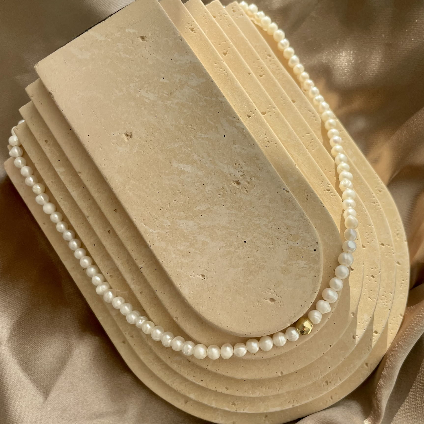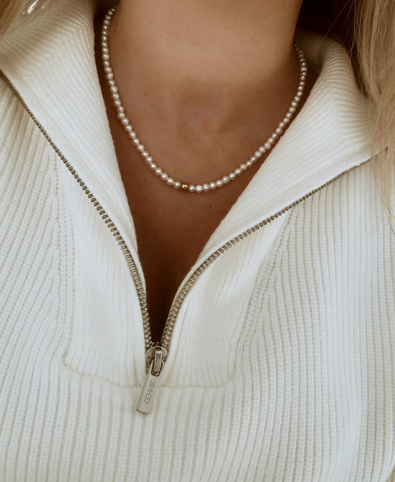 Centralnym akcentem biżuterii jest pojedyncza złota kulka, która dodaje całości minimalistycznego blasku i podkreśla jej elegancki charakter. Subtelny detal wprowadza lekkość i współczesną stylistykę, zachowując jednocześnie naturalne piękno klasycznych pereł.