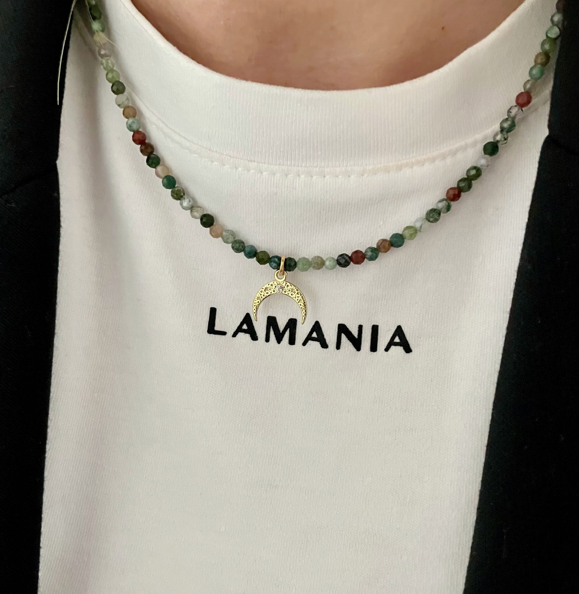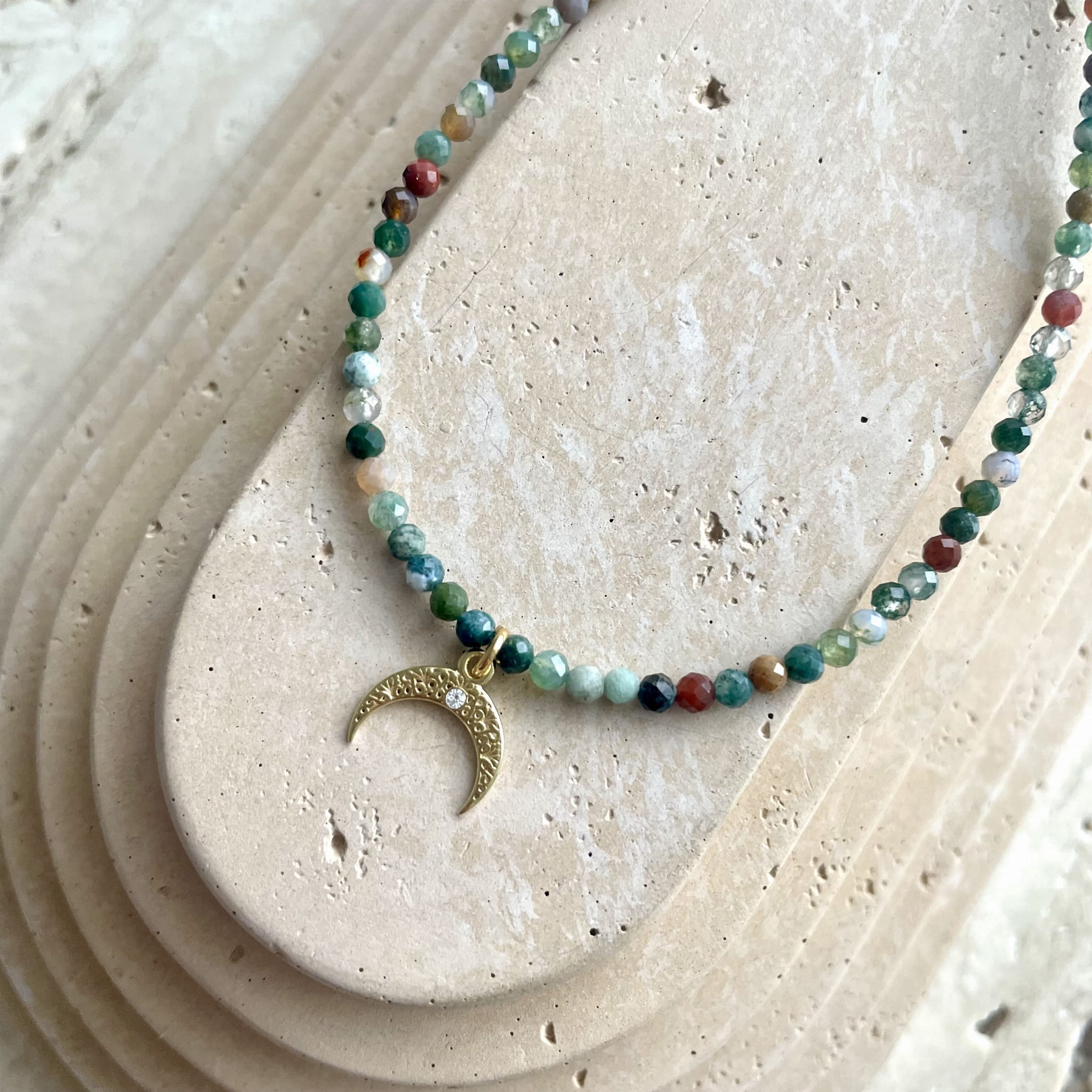 Połączenie naturalnych minerałów z misterną, złoconą zawieszką tworzy kompozycję pełną równowagi i delikatnej symboliki. Lunula — symbol kobiecej energii, opieki i intuicji — sprawia, że naszyjnik staje się nie tylko ozdobą, ale również osobistym amuletem.