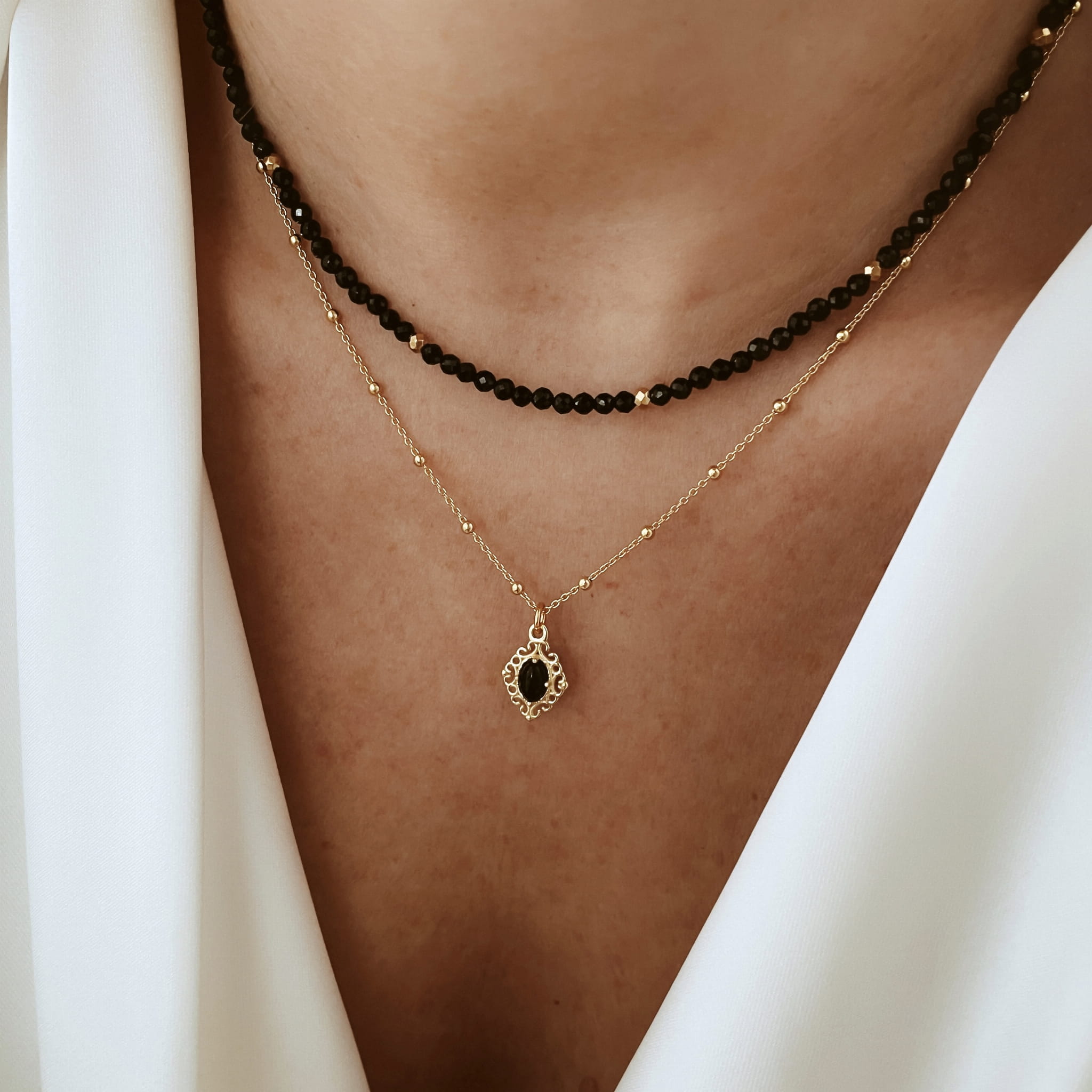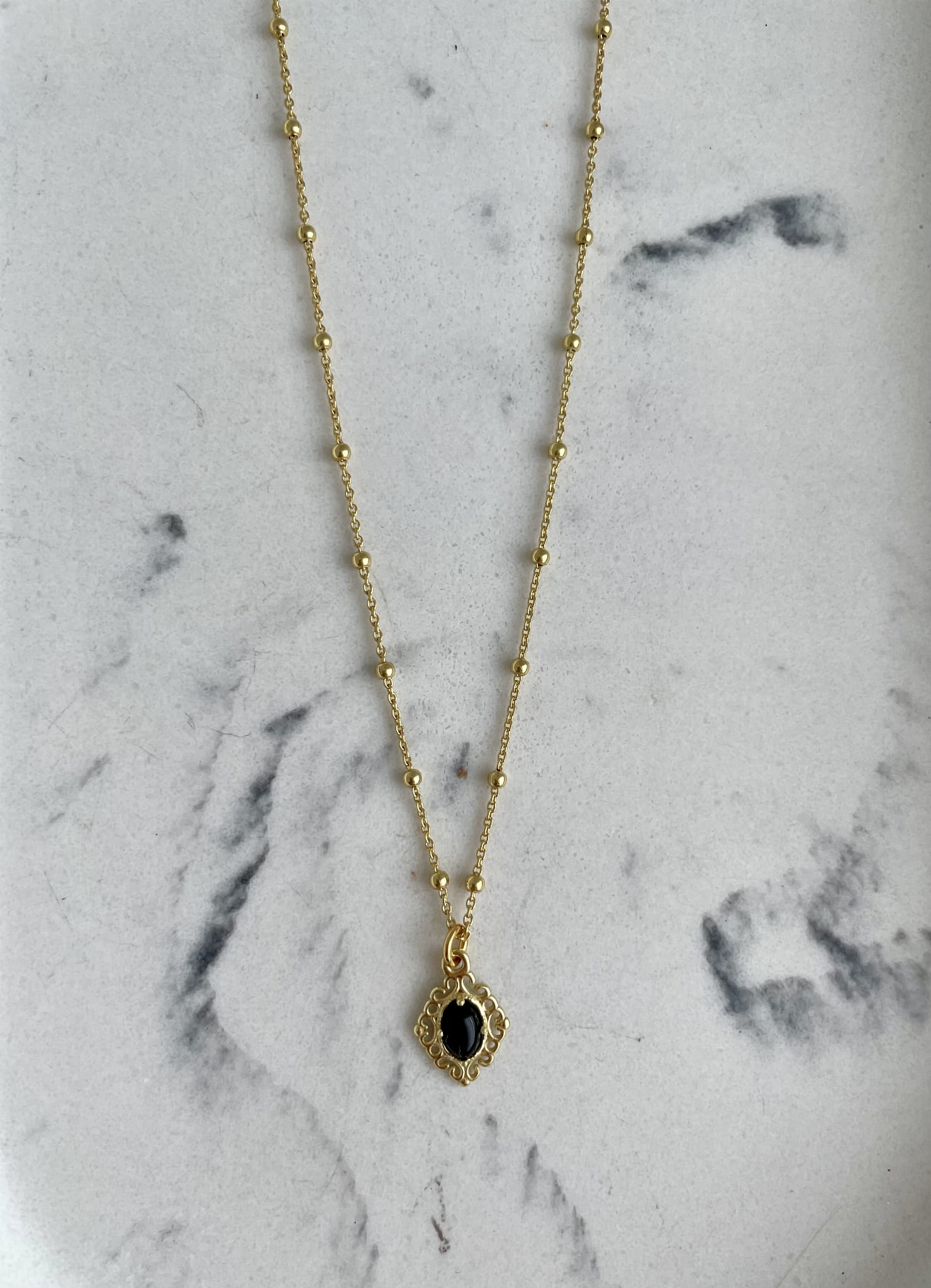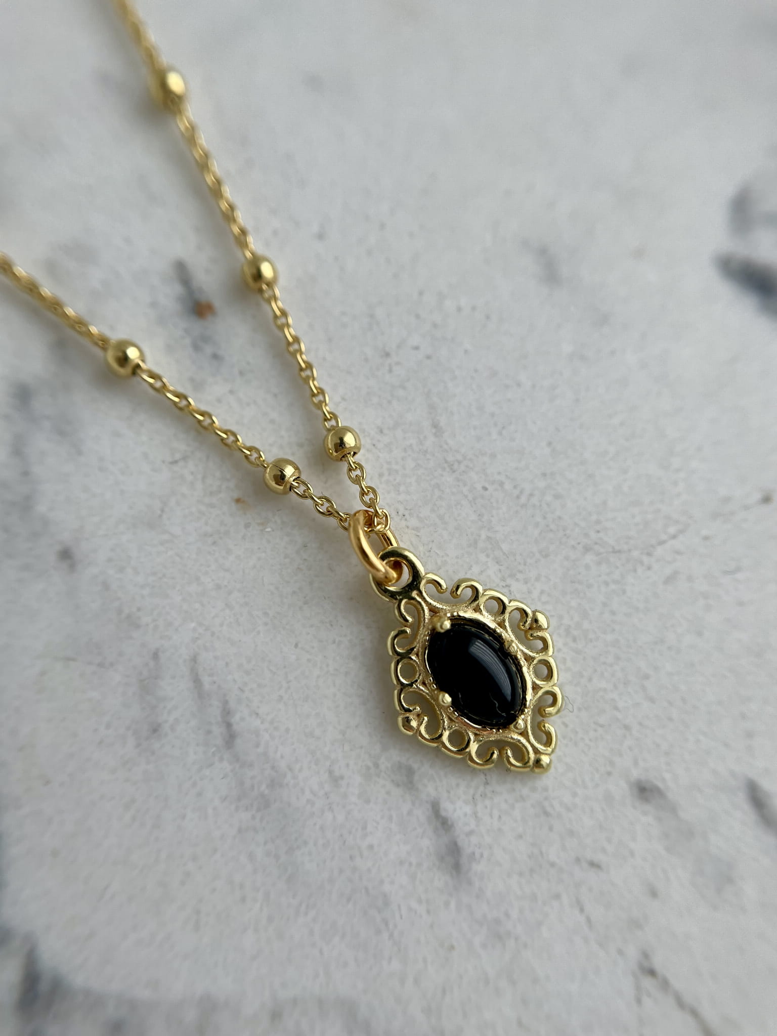 Pozłacany naszyjnik z owalnym onyksem w ozdobnym okuciu – na łańcuszku z kuleczkami