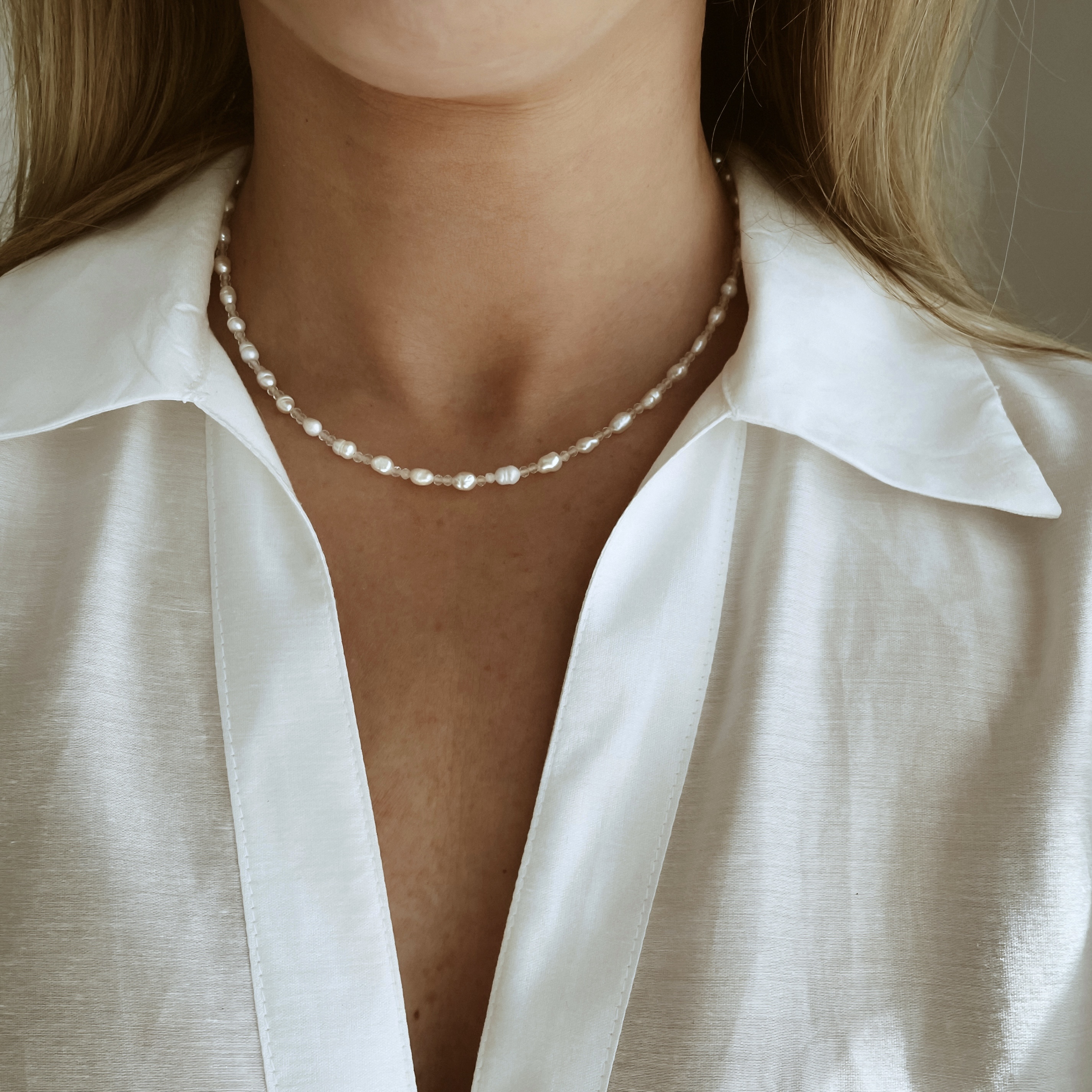 Elegancki, lekki i pełen blasku – naszyjnik wykonany z drobnych koralików z naturalnych pereł hodowlanych oraz kryształu górskiego to wyjątkowa propozycja dla miłośniczek subtelnej, a zarazem wyrazistej biżuterii. Delikatne perły o kremowej barwie harmonijnie łączą się z przejrzystym kryształem, tworząc ponadczasową kompozycję. Idealny zarówno do dziennych stylizacji, jak i jako wyrafinowany dodatek do wieczorowej sukienki.