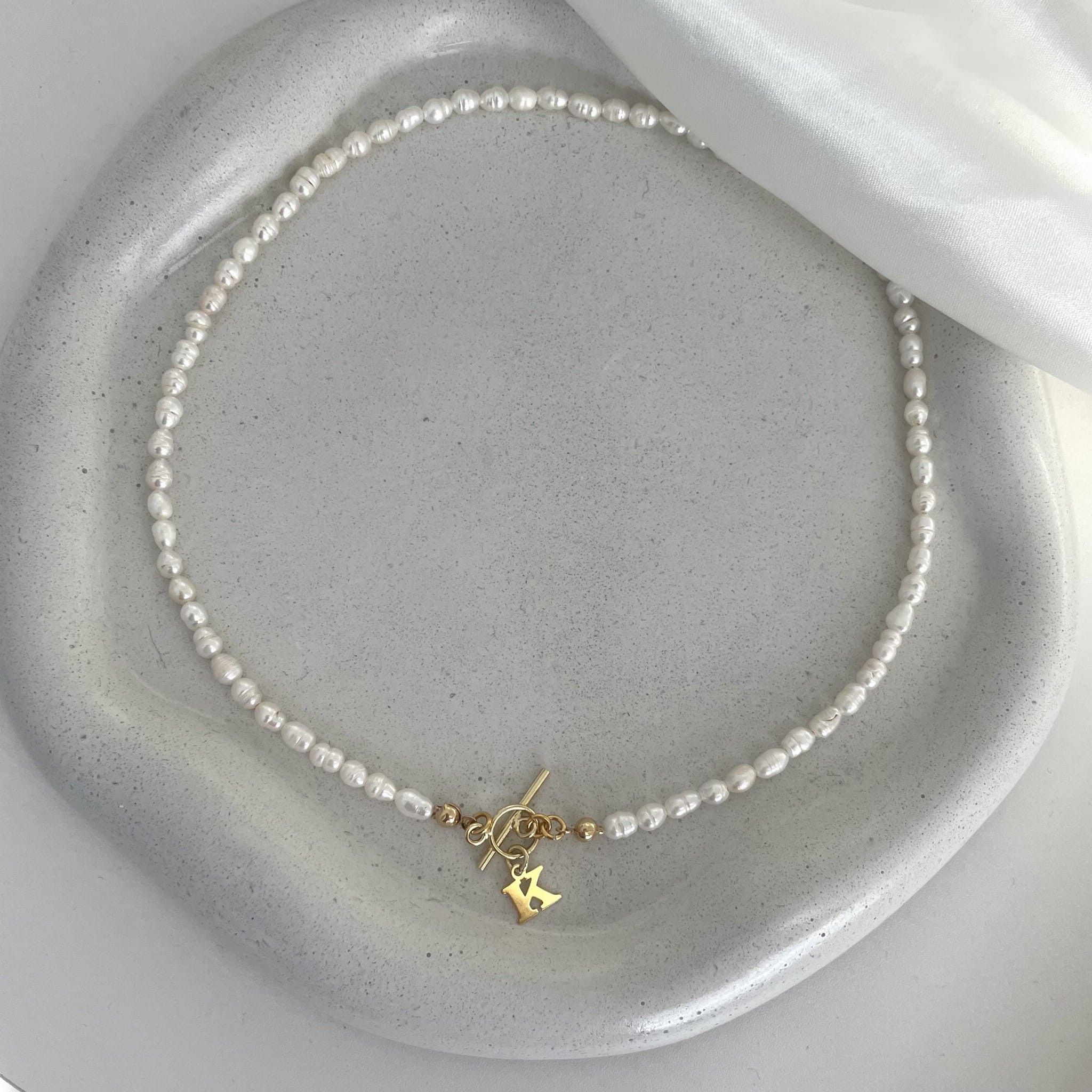 Naszyjnik z naturalnych pereł z pozłacanym zapięciem typu toggle i zawieszką w kształcie litery K