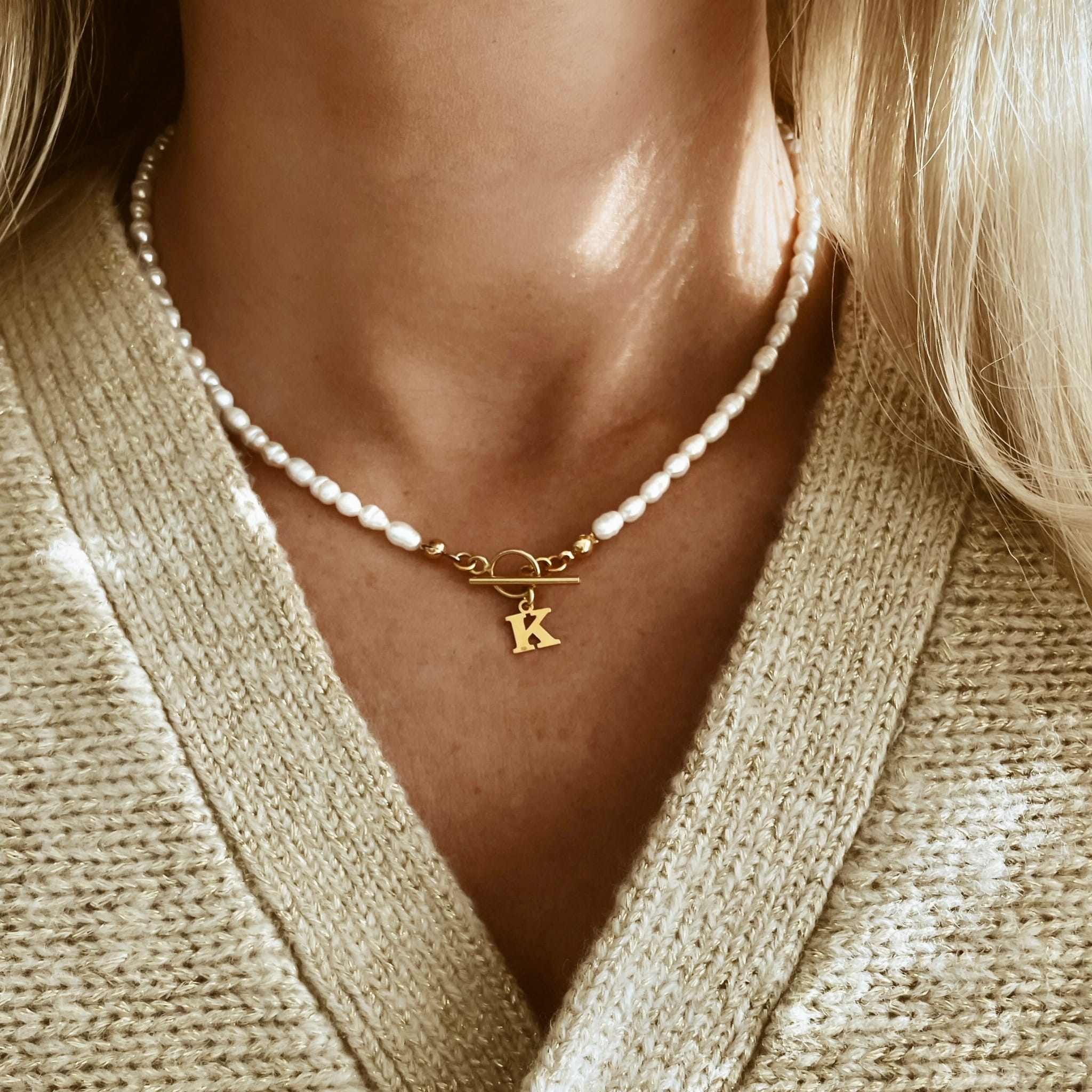 Zapięcie typu toggle oraz zawieszka w formie litery K zostały wykonane ze srebra próby 925, pokrytego warstwą złota, co nadaje całości szlachetnego i eleganckiego wykończenia. Ręczne wykonanie gwarantuje wyjątkowy charakter każdego egzemplarza oraz dbałość o najdrobniejsze detale.