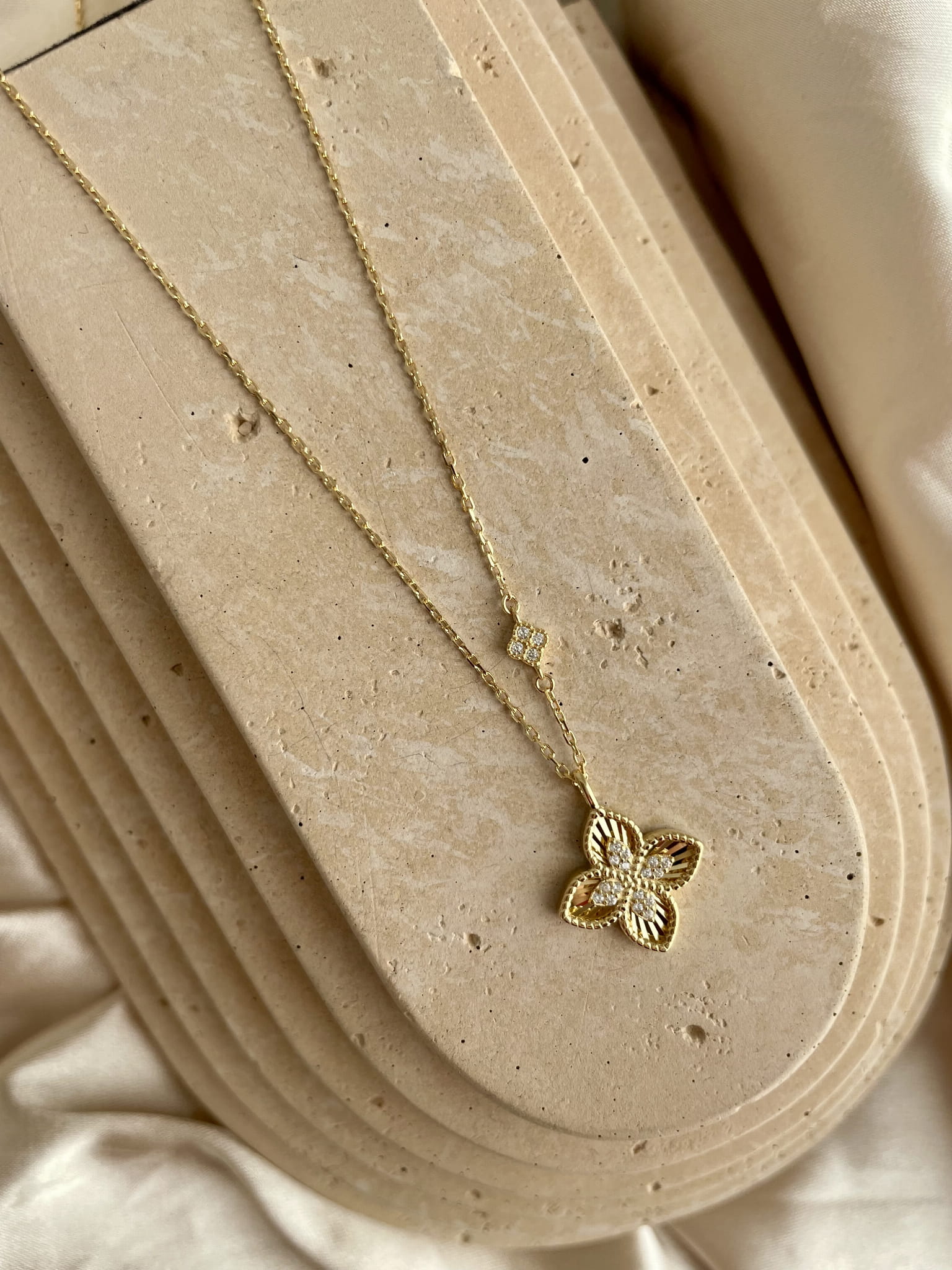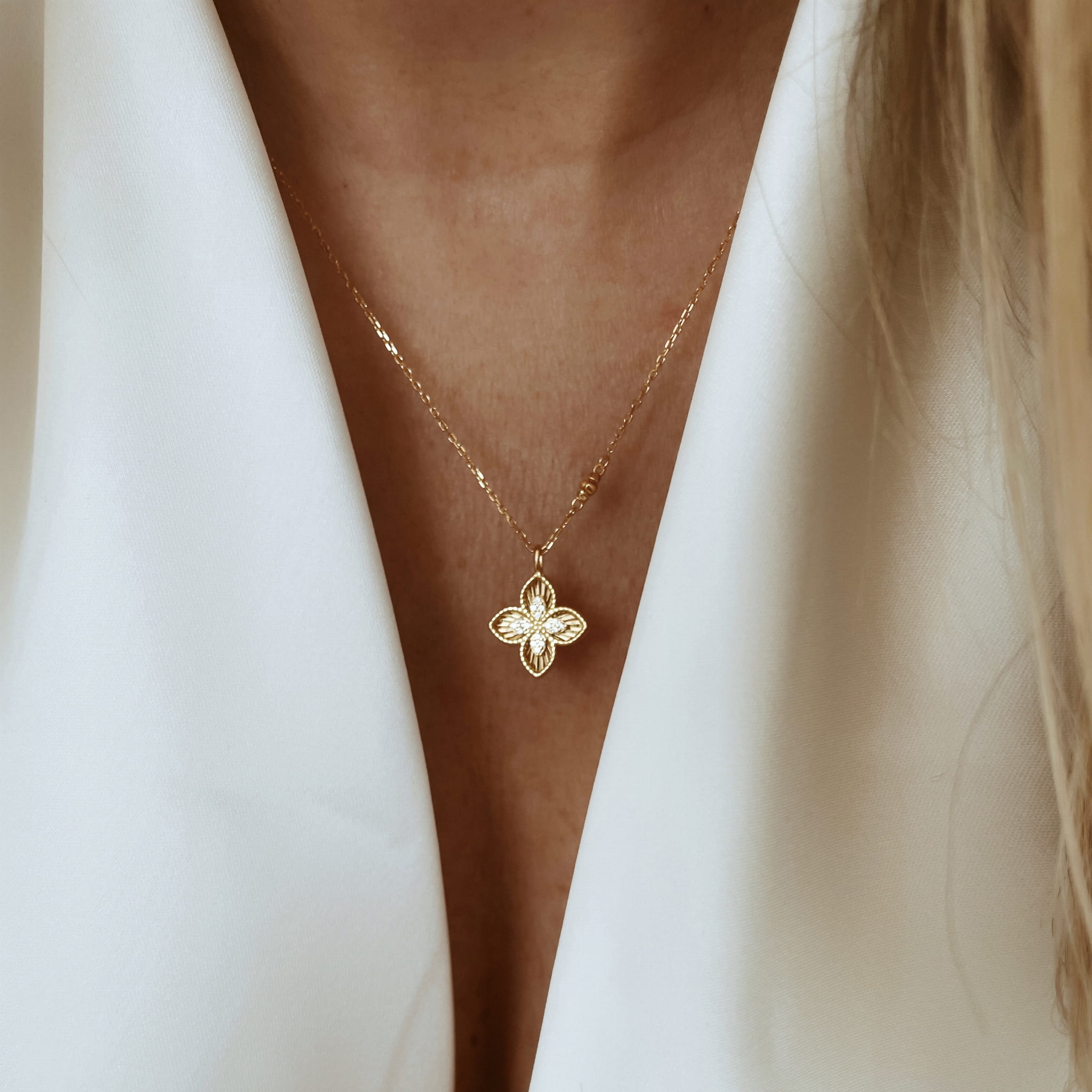 Naszyjnik z zawieszką w formie złotego kwiatu z diamentowaną powierzchnią z cyrkoniami. Jego unikalny design przyciąga spojrzenia, a subtelne detale dodają mu luksusowego charakteru. Centralnie osadzona cyrkonia w kształcie kwiatu pięknie odbija światło, nadając biżuterii delikatnego blasku, który podkreśla jej wyjątkowość.