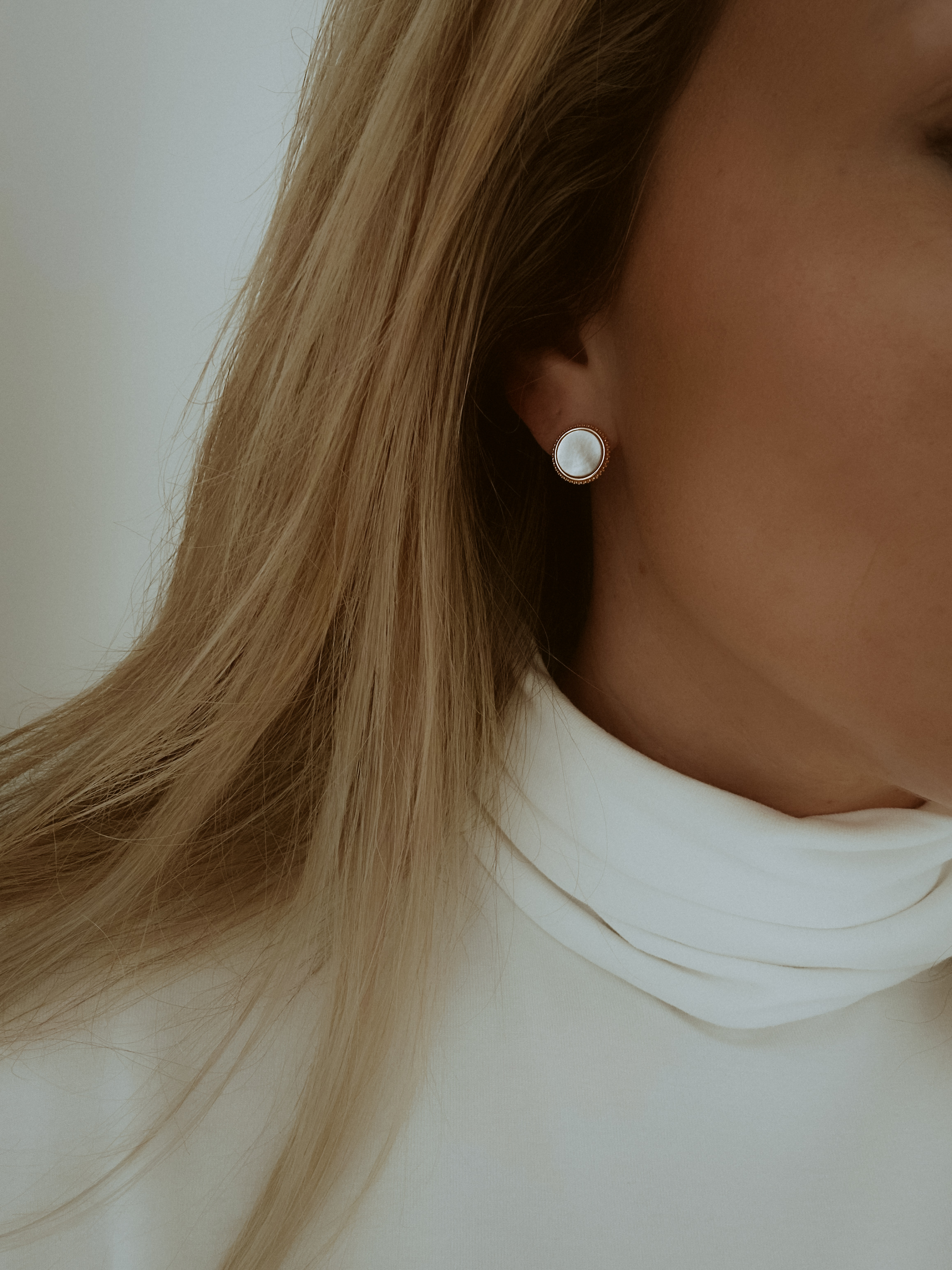 Eleganckie, okrągłe kolczyki sztyfty wypełnione subtelną masą perłową to kwintesencja ponadczasowego stylu.